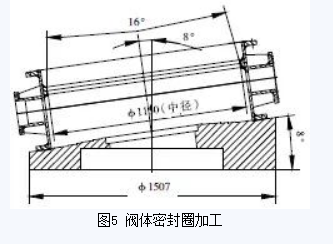 閥體起密封作為的為密封圈,焊接在閥體內(nèi)(圖5)。在2.5m立車上將組焊好的閥體裝夾在閥體密封圈加工工裝上,將立車刀桿旋轉(zhuǎn)8°,根據(jù)圖紙?jiān)O(shè)計(jì)要求,找正后沿圓錐母線方向走刀,車至未焊不銹鋼前的尺寸。然后堆焊不銹鋼,最后將焊好不銹鋼的閥體重新上立車,按上述方法車閥體密封圈至圖紙要求尺寸。最后在立車刀架上裝磨頭,對(duì)閥體密封圈進(jìn)行磨削處理,使其達(dá)到圖紙?jiān)O(shè)計(jì)粗糙度要求。